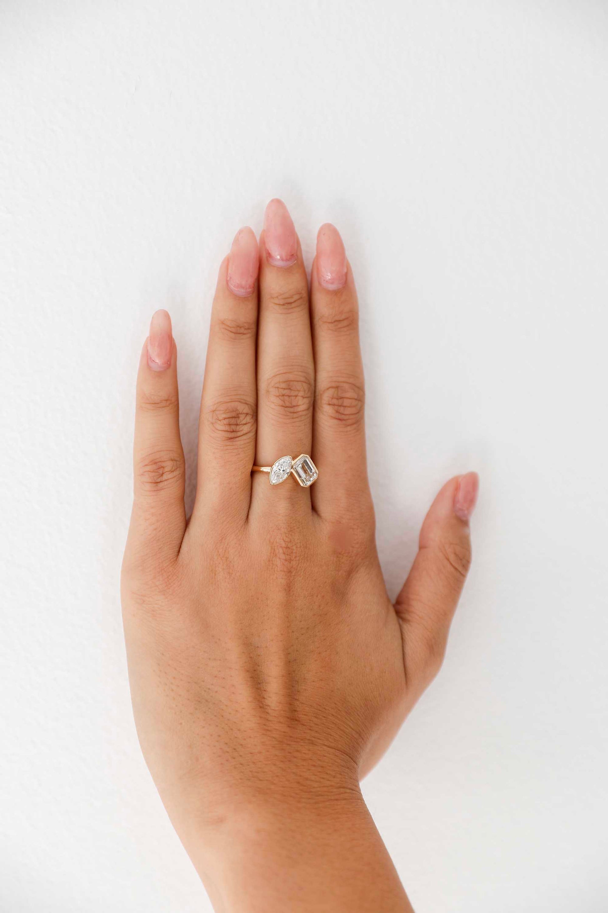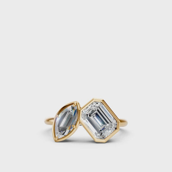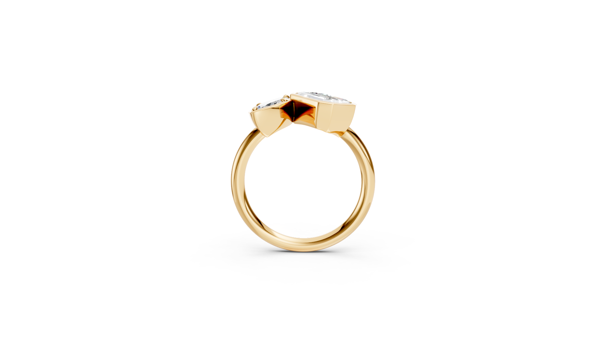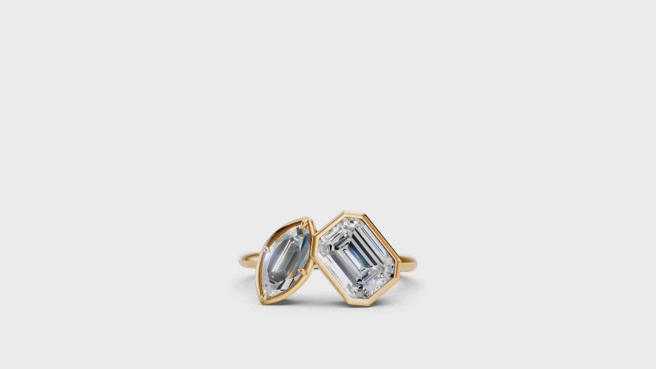 14karat yellow gold right hand ring 1 marquise lab grown diamond (.75 total carat weight), 1 emerald cut lab grown diamonds (1.92 total carat weight).