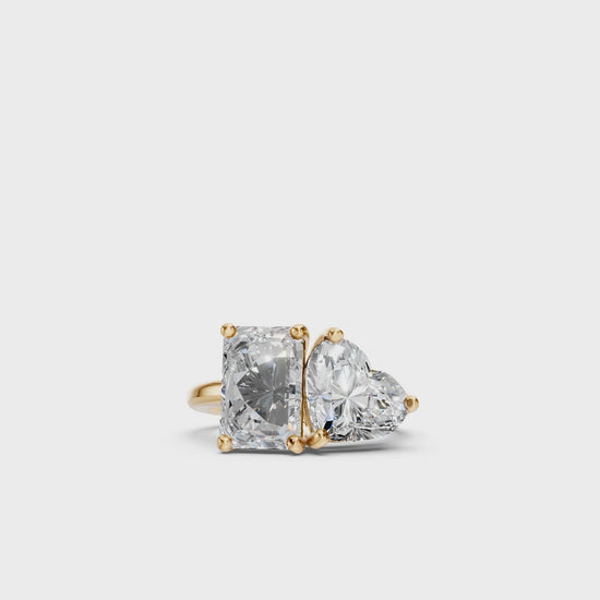14k karat white gold right hand ring one hreat shaped lab grown diamond (3.01 total carat weight), and one radiant cut lab grown diamond (3.01 total carat weight).